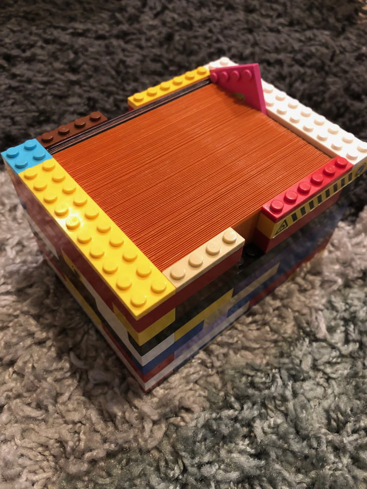 Tässä näkyy kerätyistä palikoista tehty prototyyppi sadan tuplasliivatun keräilykortin dekkiboksista. Just oikeilla tekstuureilla jos tämmöisen tahtoisi, niin tulisi yllättävän kalliiksi. Tämä rakennelma purettiin pian valmistumisen jälkeen, kun ei raaskinut juniorin palikkakokoelmasta ryöstää omaan käyttöön. Pakkasäilön mitat nappasin kuitenkin tästä talteen myöhempää käyttöä varten.